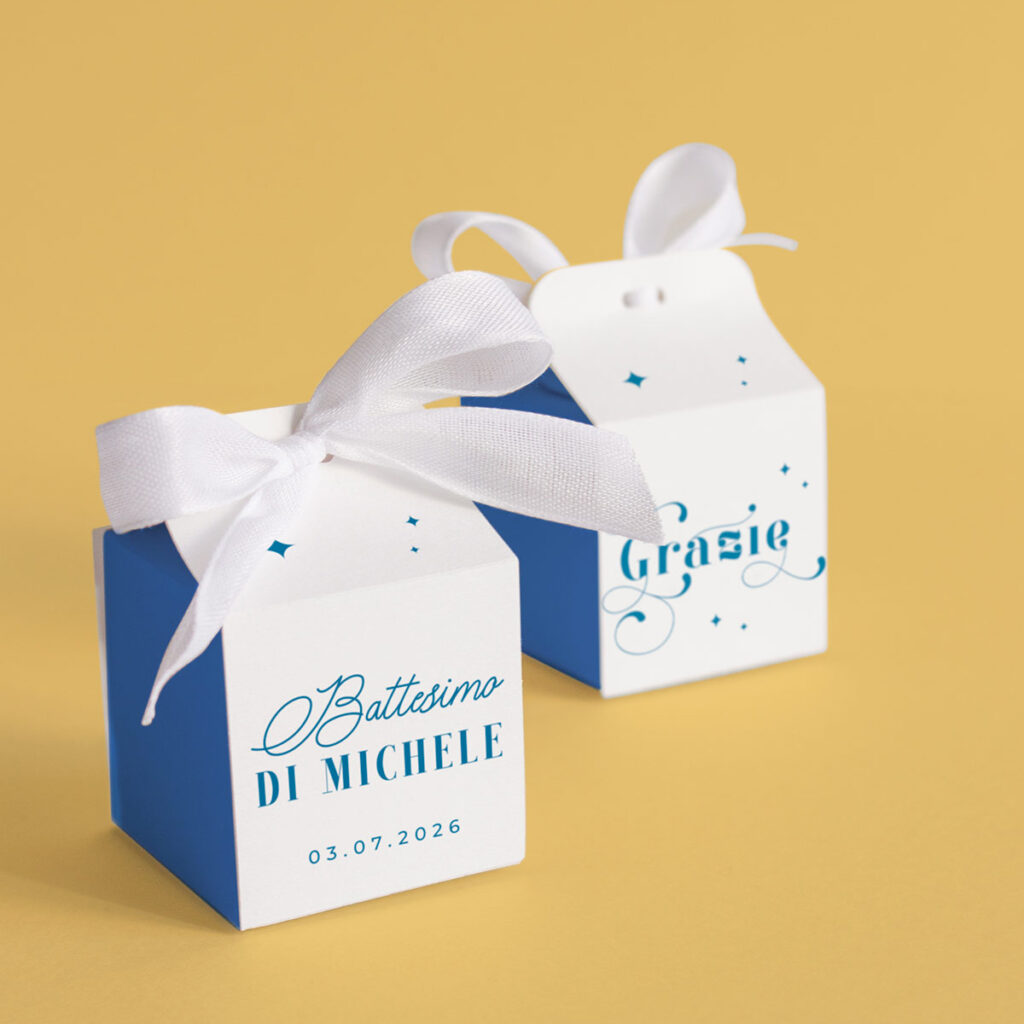 Bomboniere per la comunione classiche: scatoline bicolore con disegni eleganti