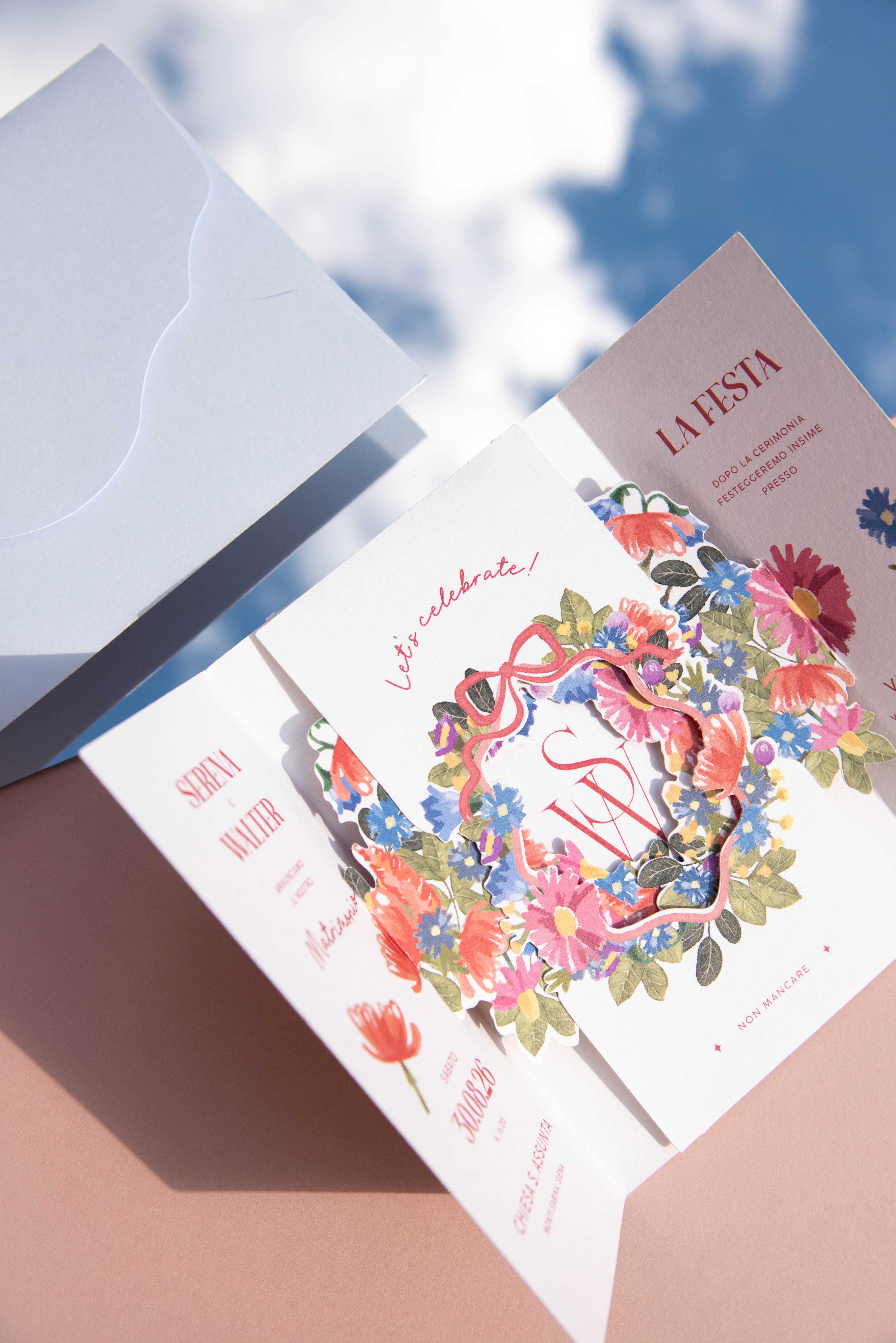 Delia è una partecipazione Pop-Up artigianale progettata da noi per rendere speciale il vostro matrimonio. E’ un biglietto sagomato che in apertura svela un raffinato gioco di livelli.