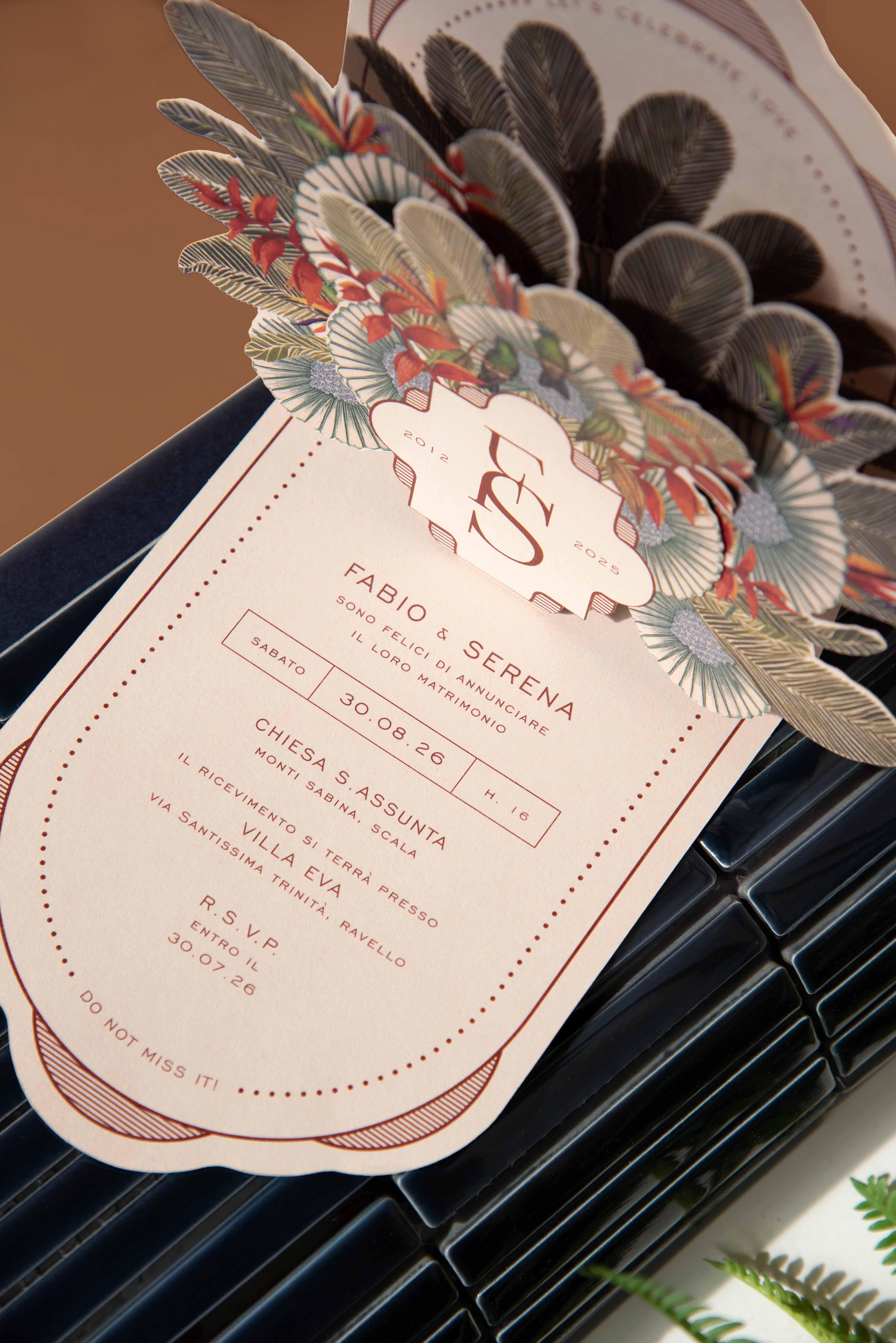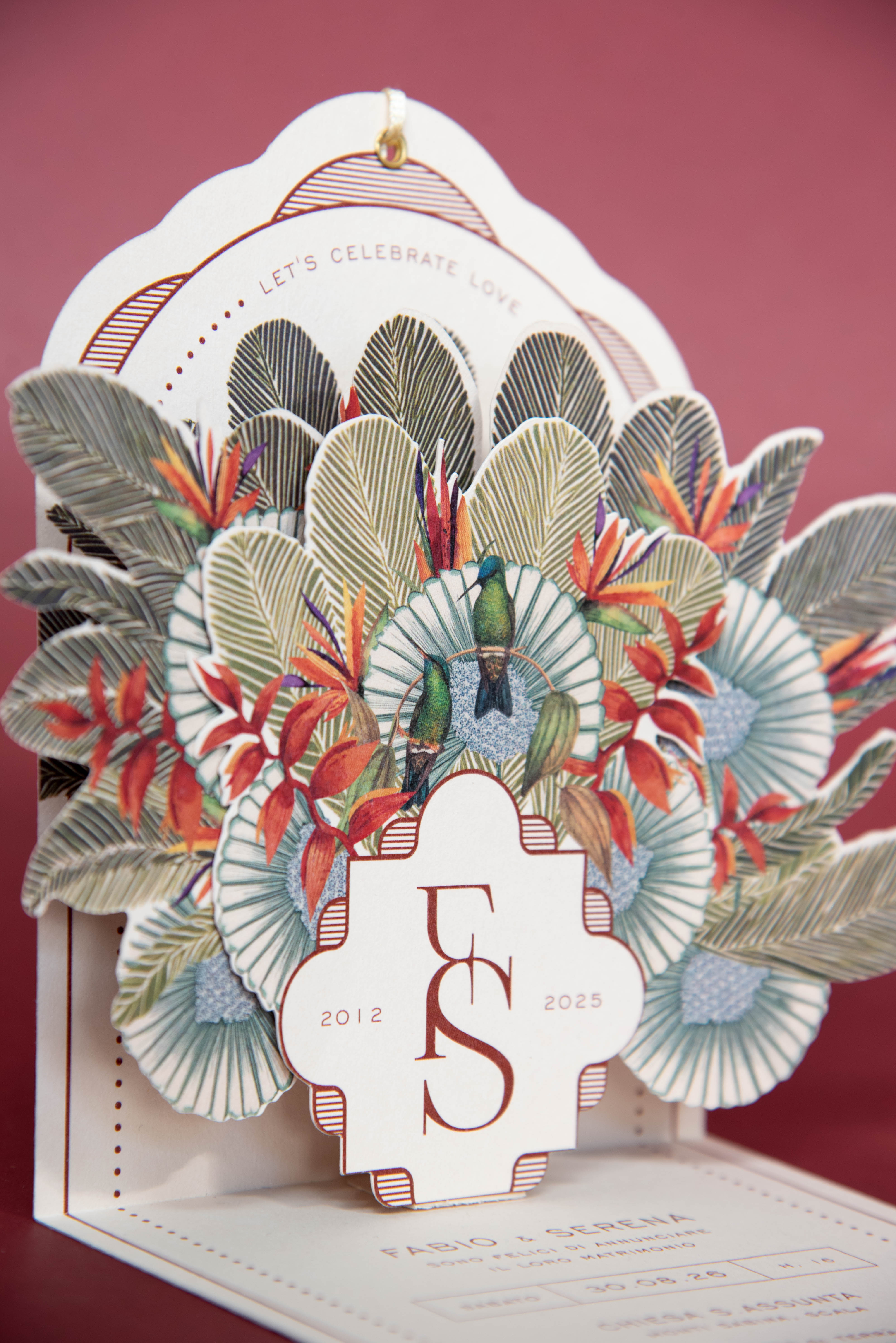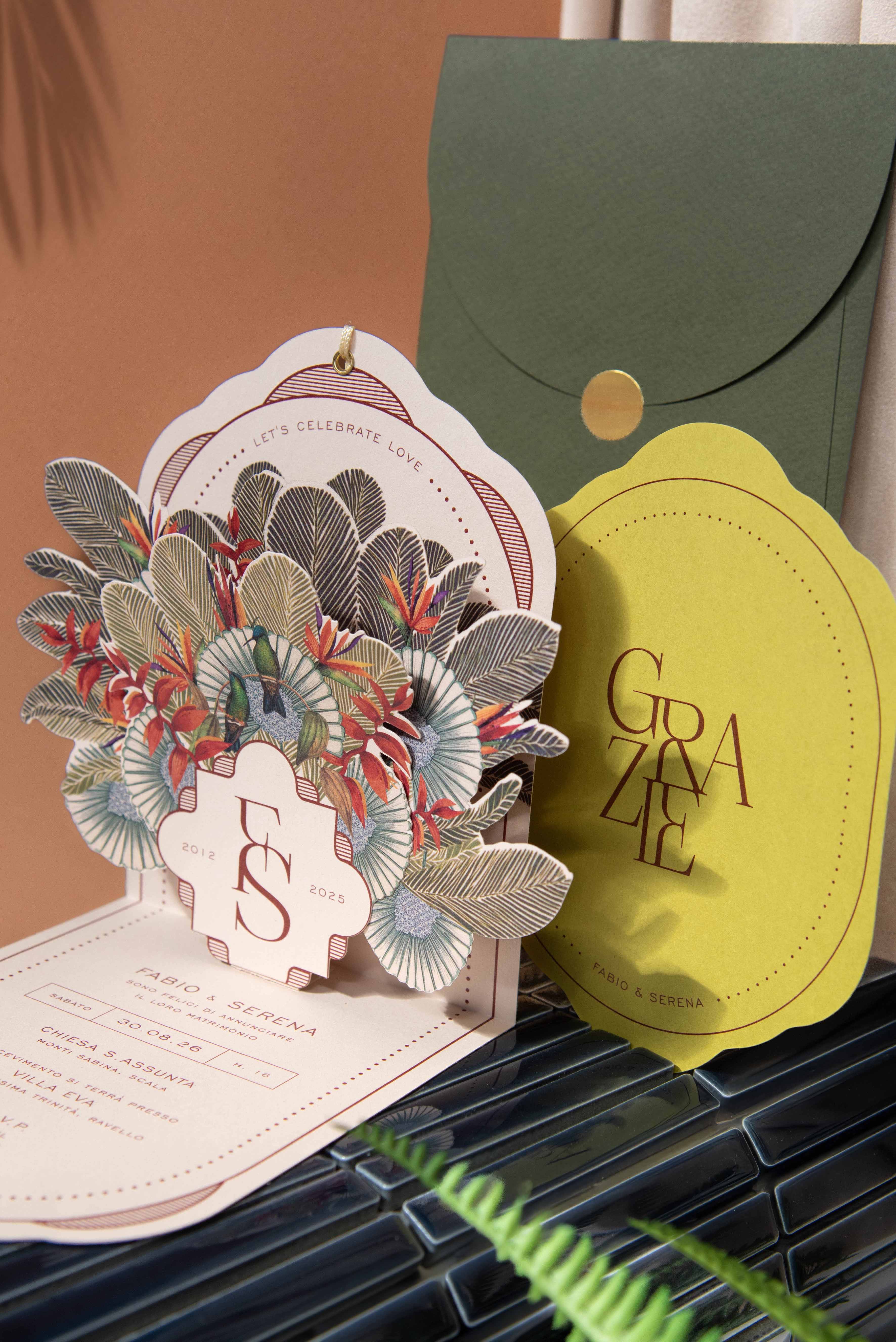 Emerald è una partecipazione Pop-Up artigianale progettata da noi per rendere speciale il vostro matrimonio. E’ un biglietto sagomato che in apertura svela un raffinato gioco di livelli.