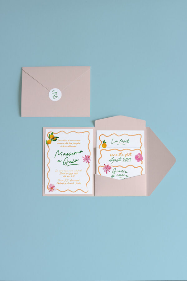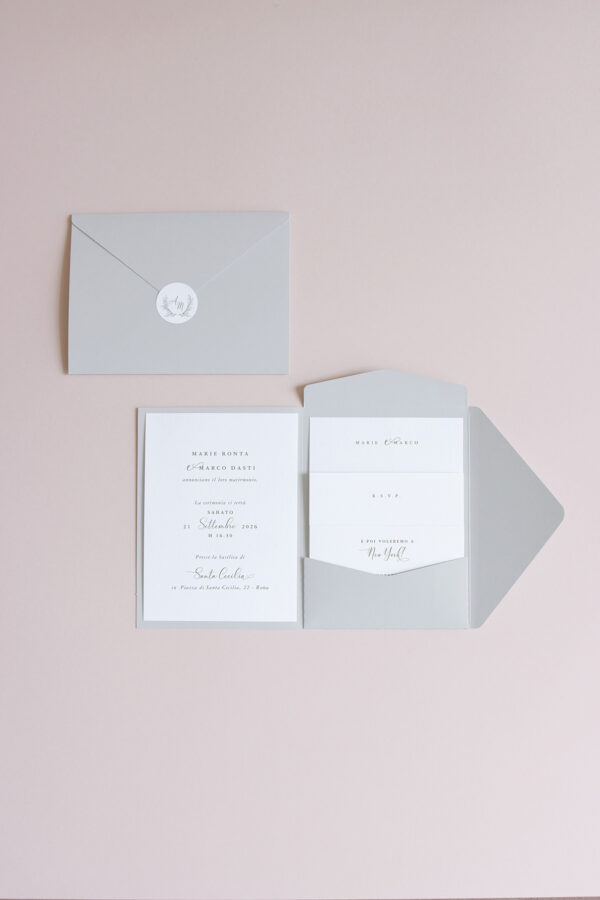 Il Pocket Fold è una partecipazione di nozze completo di quattro biglietti di dimensioni differenti, stampati fronte retro e da un adesivo di chiusura. Puoi scegliere il colore del cofanetto esterno da abbinare ai colori della grafica e personalizzarlo abbinando un sigillo in ceralacca e/o un nastrino abbinato. E’ la partecipazione adatta agli sposi che hanno tante informazioni da dare agli invitati. Ad esempio a chi deve comunicare due location (cerimonia e ricevimento), a chi vuole una timeline dell’evento o a chi vuole semplicemente dare informazioni tecniche come dresscode, transfer e accomodation.