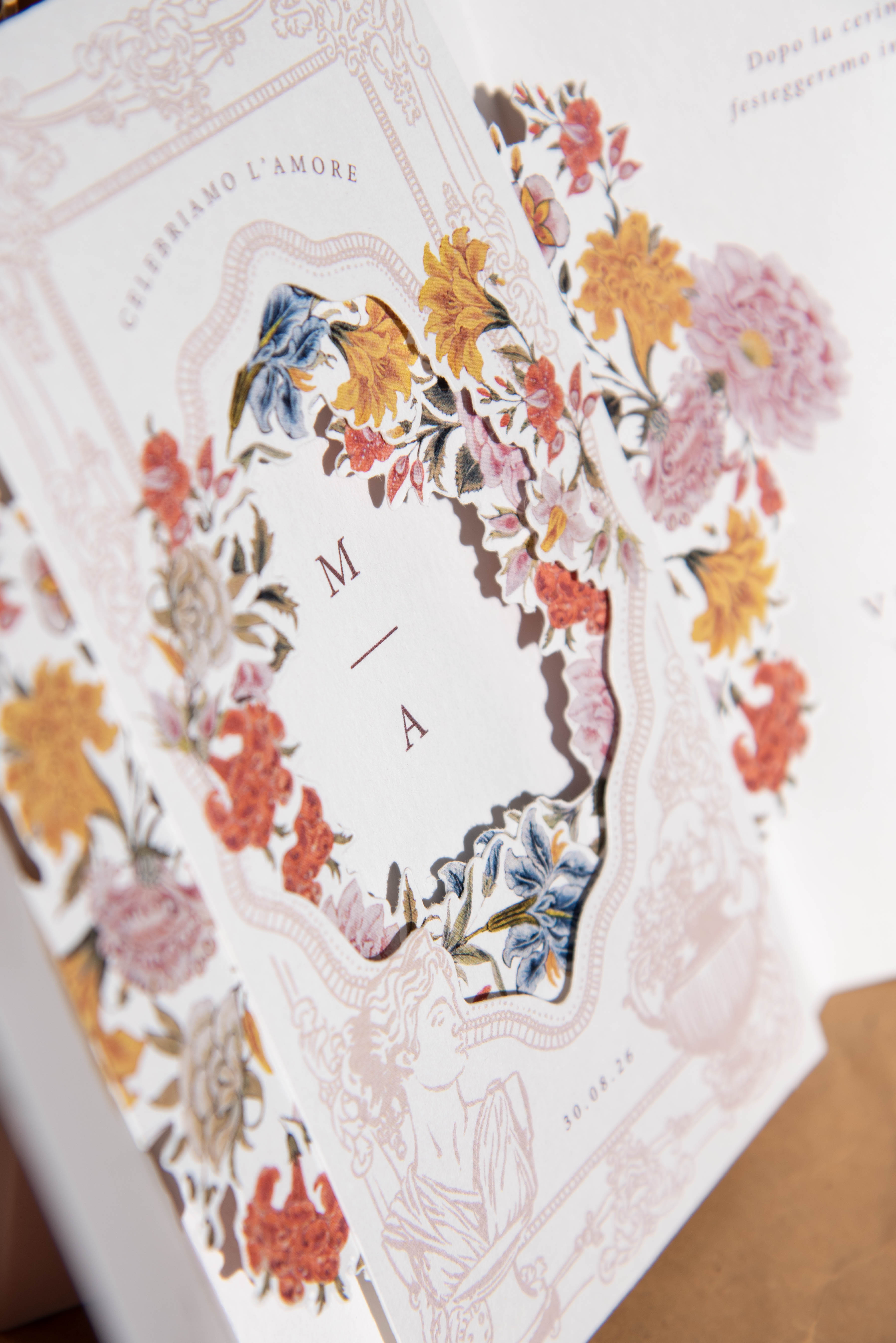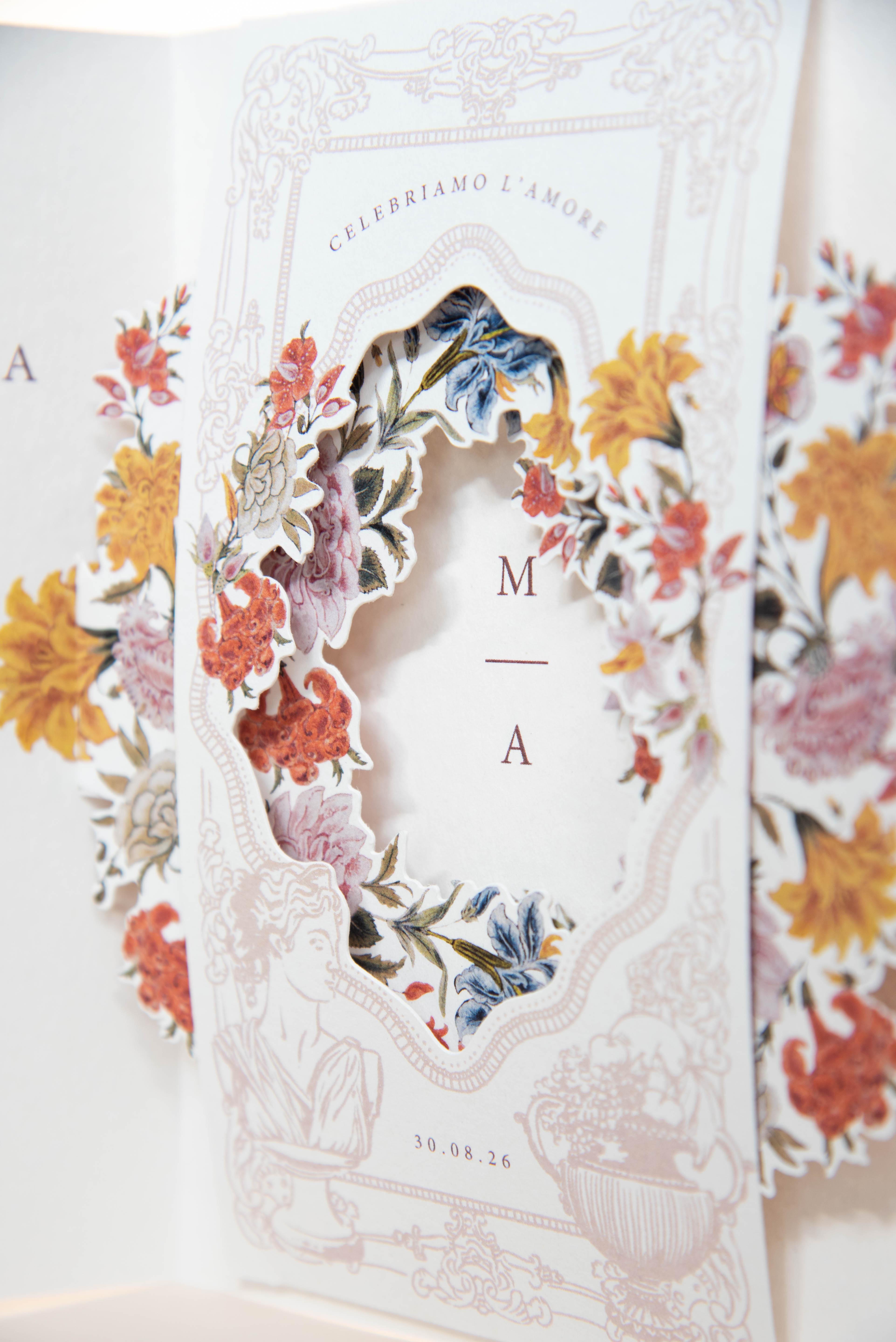 Cassandra รจ una partecipazione Pop-Up artigianale progettata da noi per rendere speciale il vostro matrimonio. E’ un biglietto sagomato che in apertura svela un raffinato gioco di livelli.