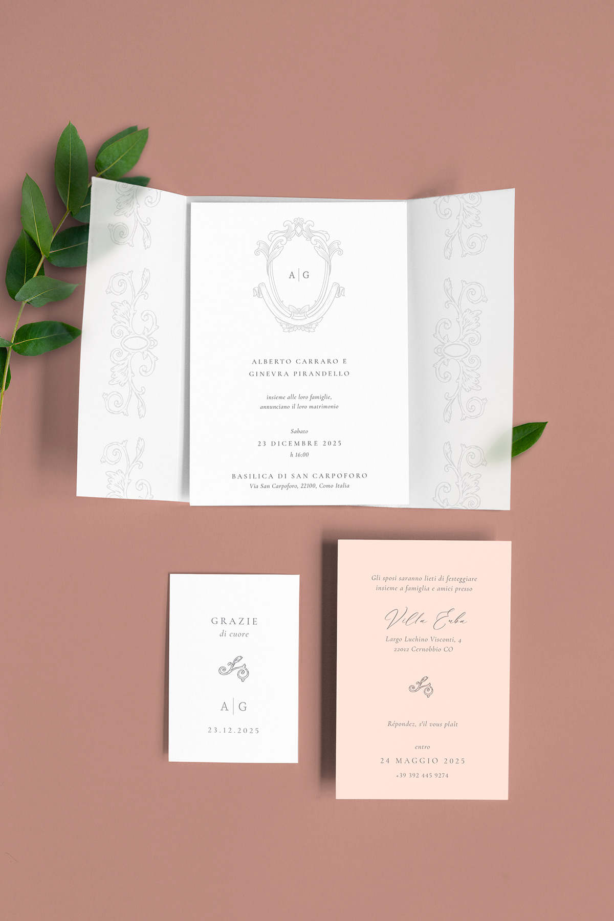 Carta dei biglietti interni: Fedrigoni FSC Ecologica 250 grammi, leggermente martellata.