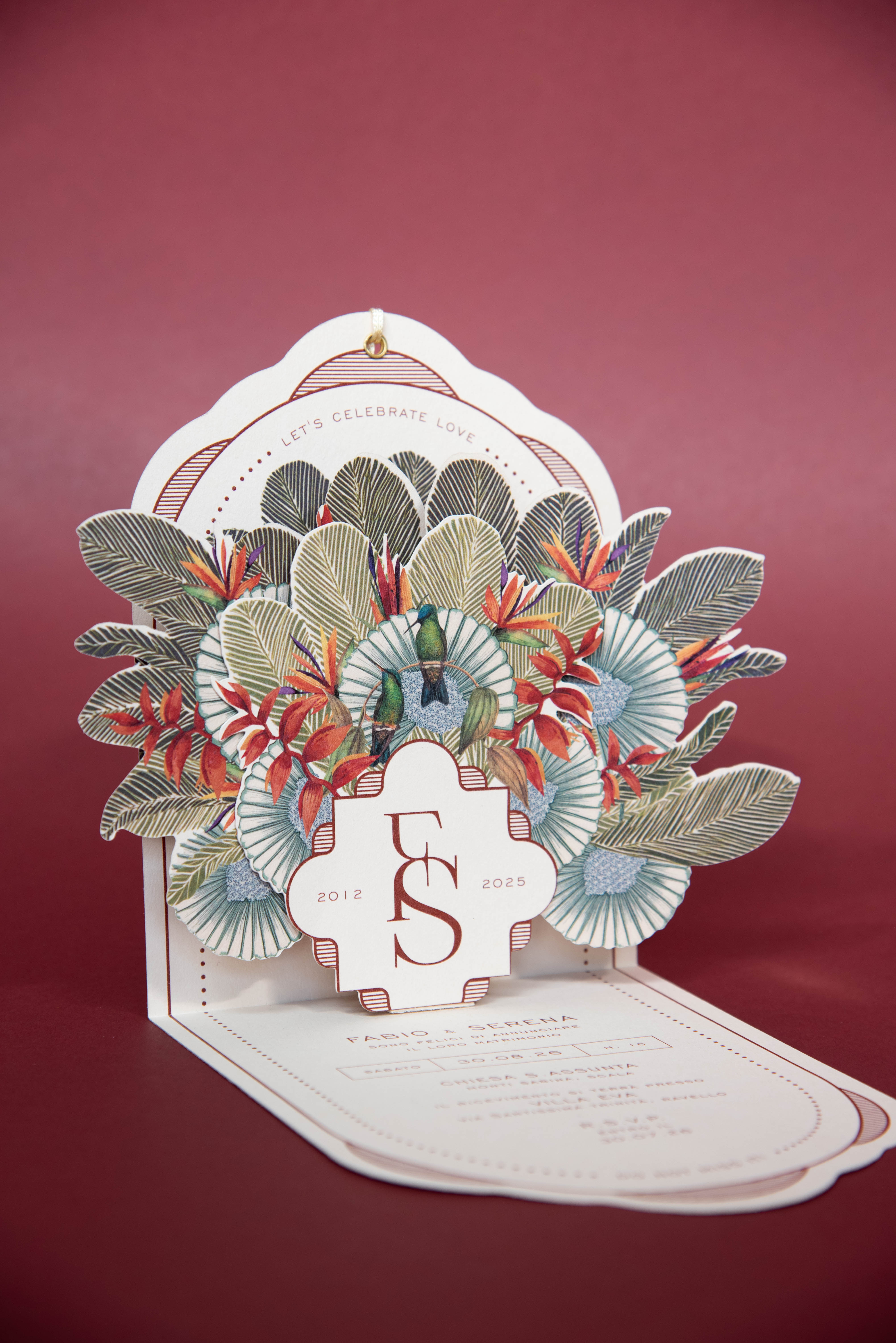 Emerald รจ una partecipazione Pop-Up artigianale progettata da noi per rendere speciale il vostro matrimonio. E’ un biglietto sagomato che in apertura svela un raffinato gioco di livelli.