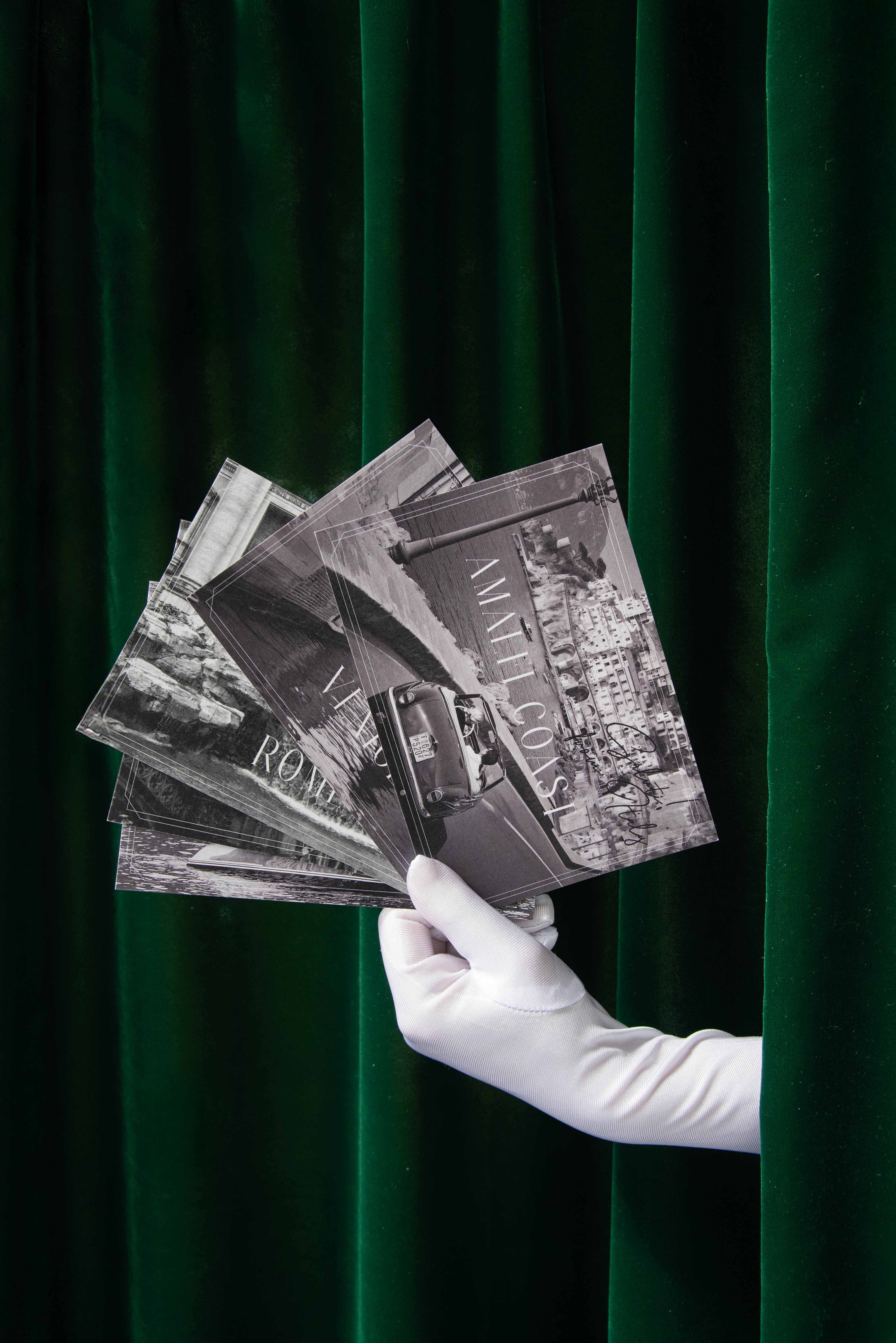 Sotto, una tasca a mezzaluna custodisce inserti illustrati in bianco e nero dal sapore rรฉtro.