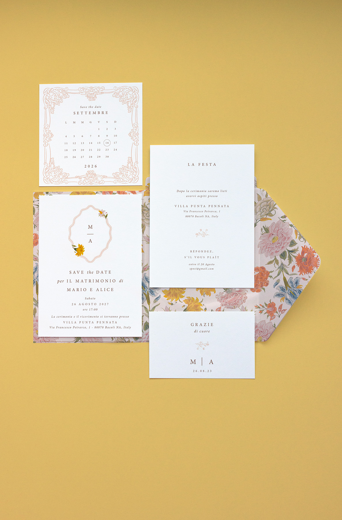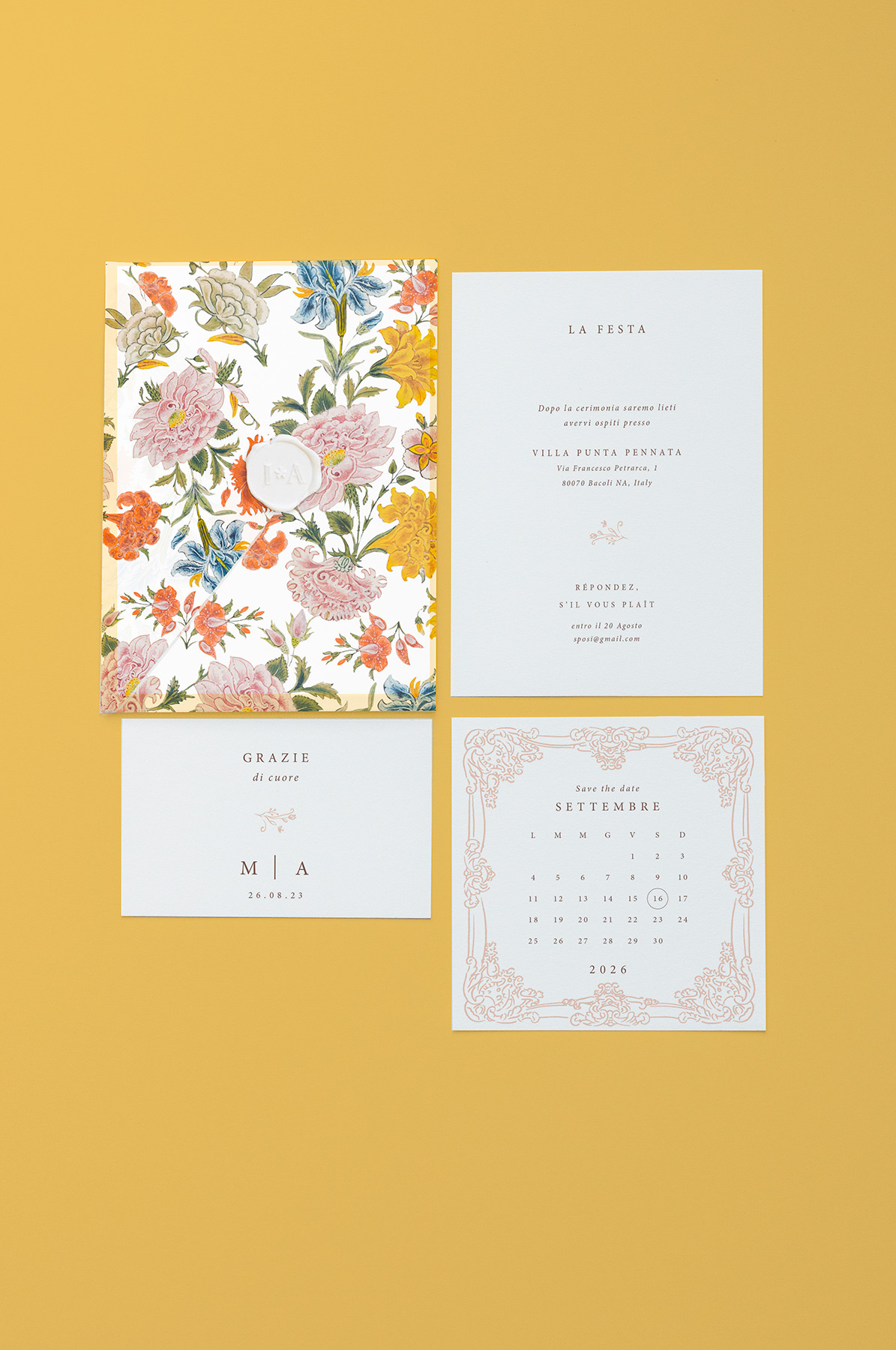 Carta dei biglietti interni: Fedrigoni FSC Ecologica 250 grammi, leggermente martellata.