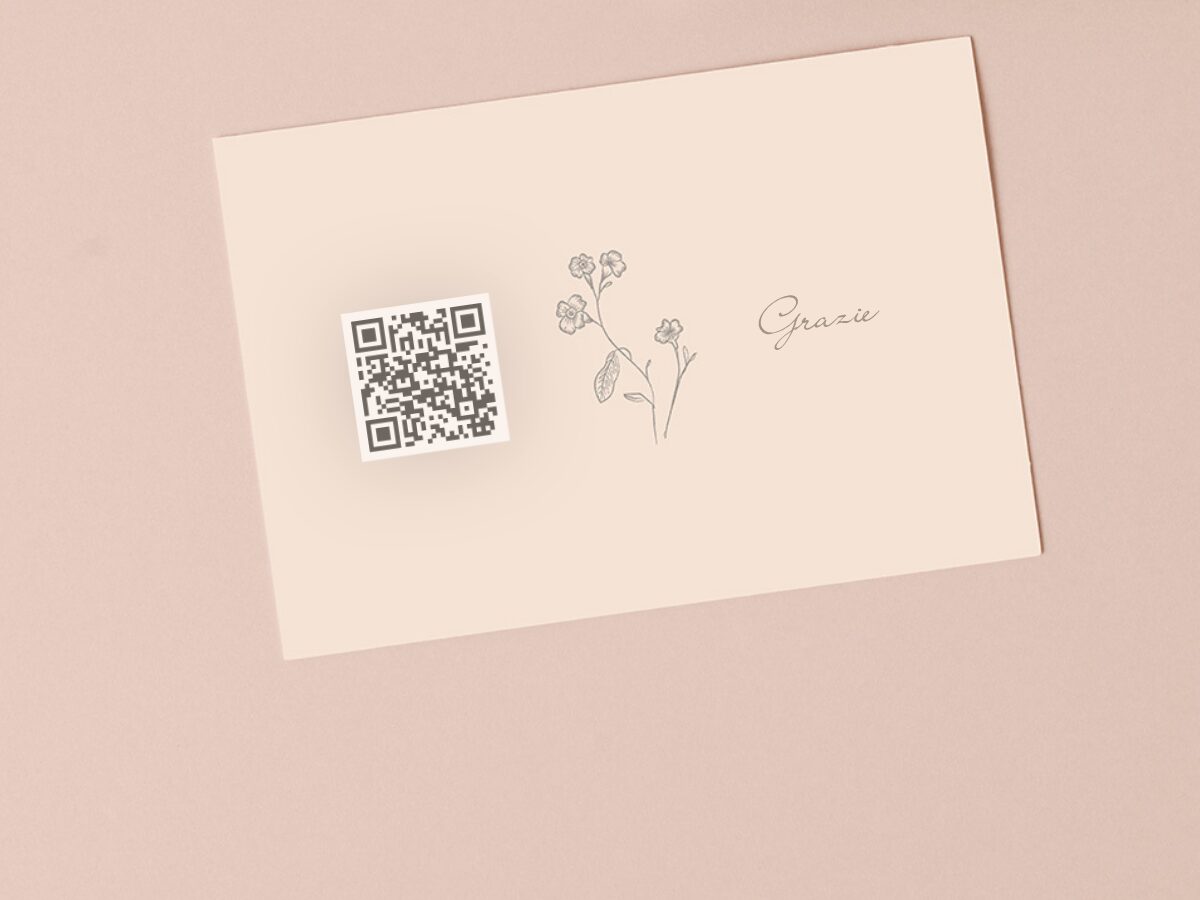 - La regola della separazione: L’invito principale, quello che annuncia i vostri nomi e la data, deve rimanere “pulito” e formale. Il QR code deve avere il suo palcoscenico dedicato: un cartoncino a parte, dalle dimensioni ridotte.