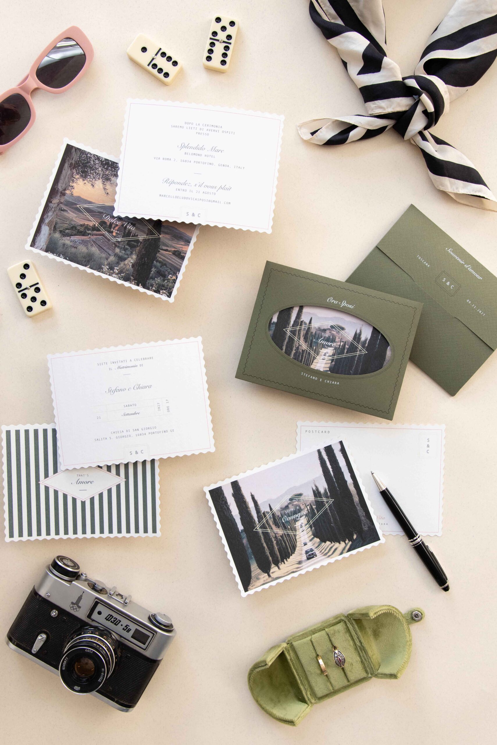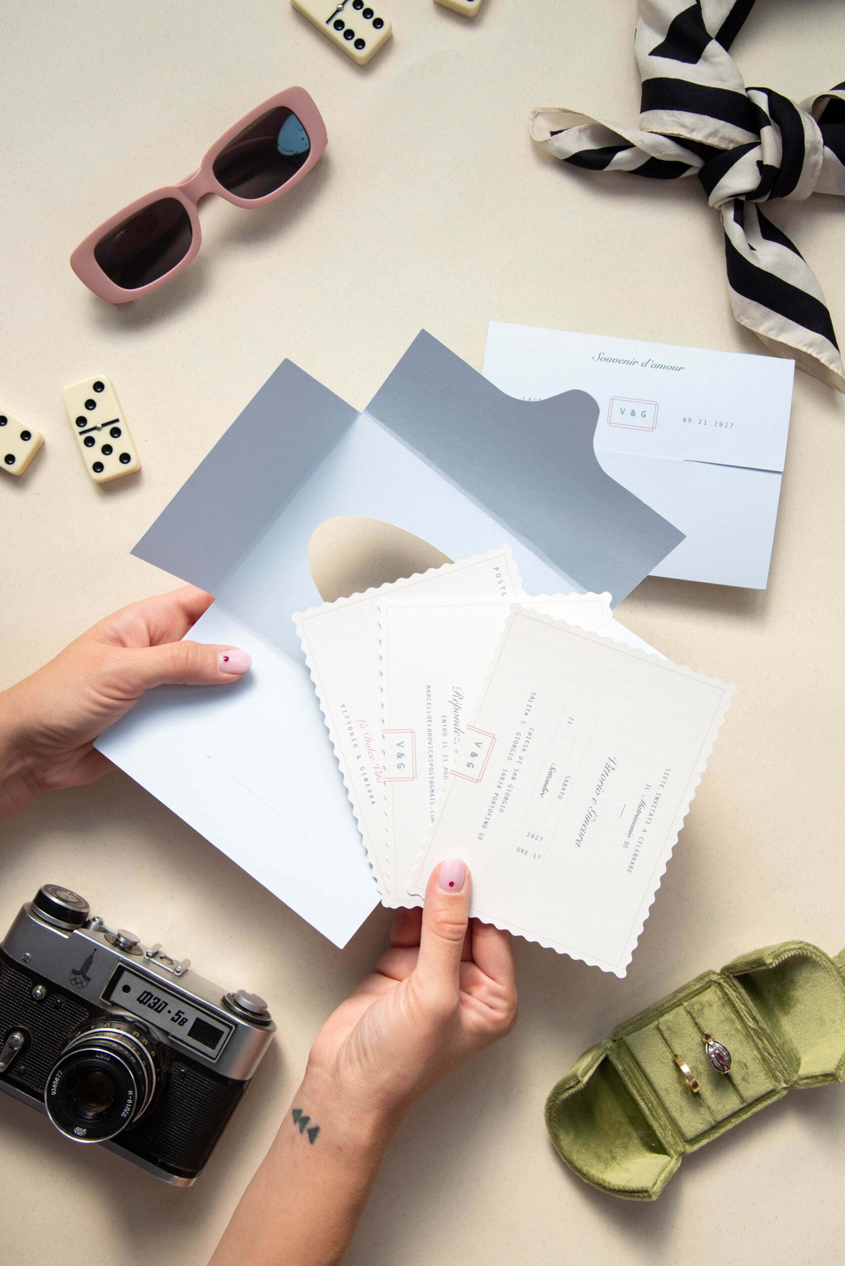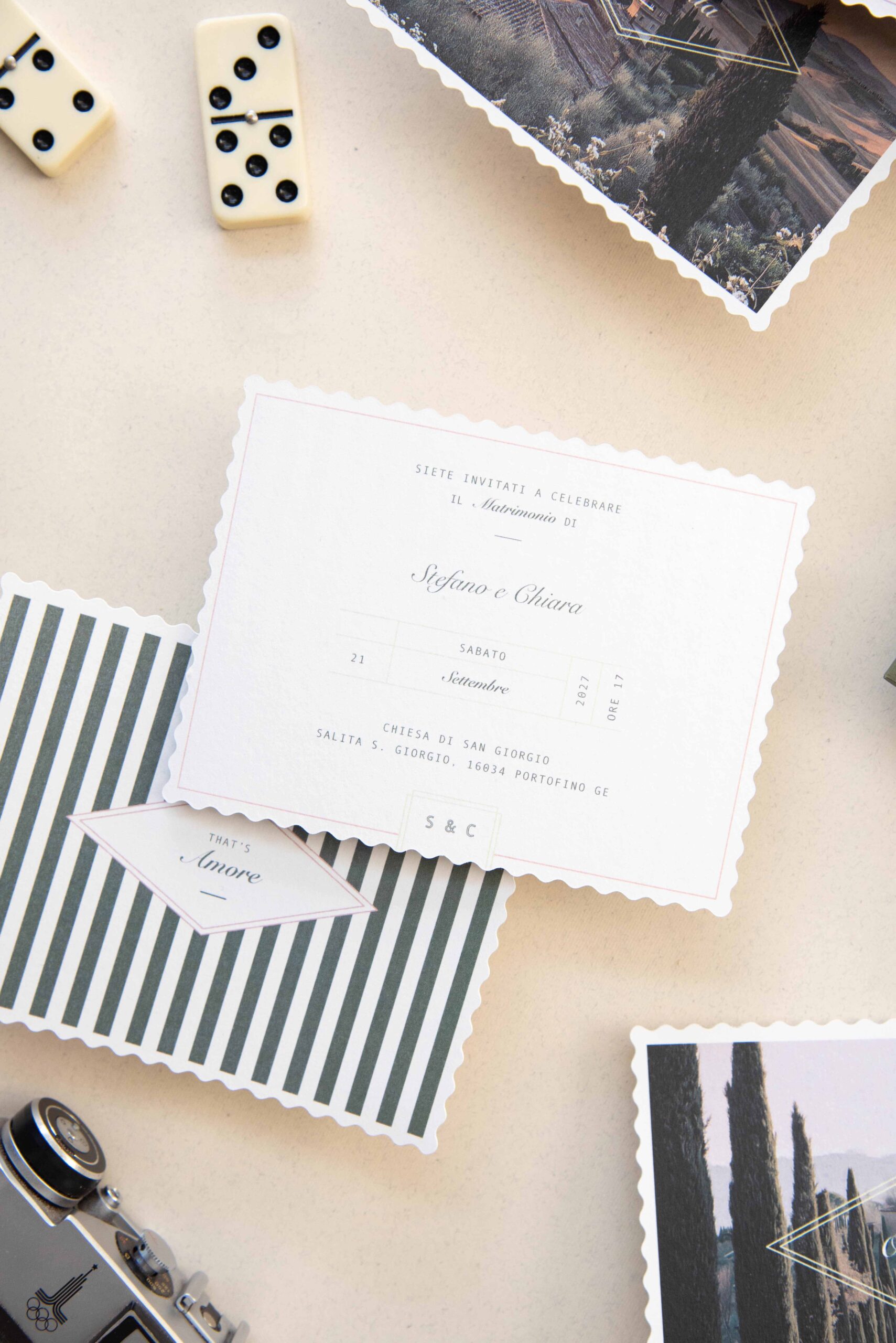 Stampato su una selezione di carte Fedrigoni e Gmund, è ricco di dettagli e piccole sorprese. Le tre card principali sono tutte sagomate con un bordo smerlato dal sapore anni 50, le geometrie dei dettali contrastano con le foto vintage, il cofanetto forato con la chiusura ad incastro rende la busta un piccolo regalo.