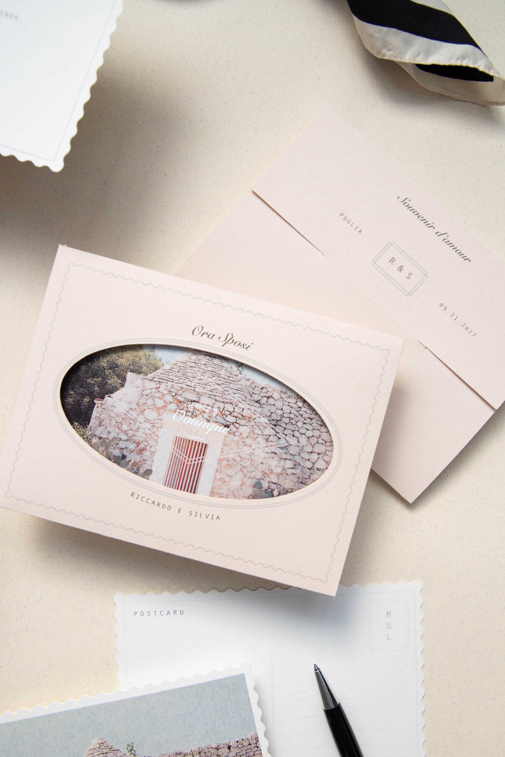 L’invito di nozze Wish you were here è un futuro souvenir del vostro matrimonio.